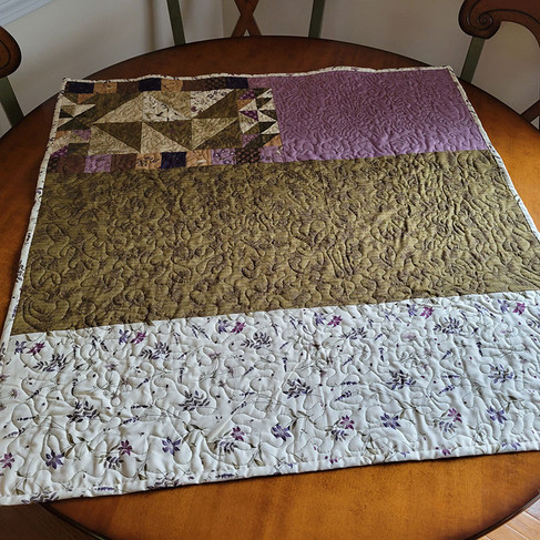 I did use it on the kitchen table because I want to protect the wood top. I used a line of Moda fabric called Potting Shed. It is from quite a while ago. I didn't have enough for the back, and had some scraps that I was piecing together. I was thinking of making up a table runner, and didn't like how it came out. I wasn't sure what to do with it, but it was great for the backing of the quilt.